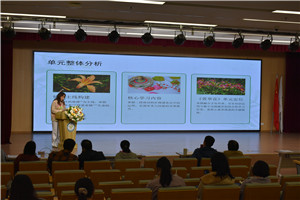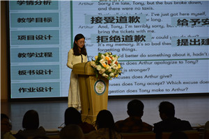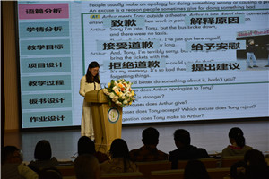 英语组的束嘉蓉老师说课主题为《9AM2U5 Speaking: Making apologies and excuses》,以“解交往之惑,筑暖心之桥”为项目化,通过创设真实情境,引导学生学习道歉与回应。课程巧妙融合生活技能与人工智能,在提升语言能力的同时,培养学生的诚信品格与综合素养。戚菲菲老师说课《7AU5 Viewing and listening: Film release》,以“电影宣发”为主线,通过读电影海报和听电影访谈,引导学生系统构建关于电影要素的话题知识框架,有效提升学生在真实语境中的视听说综合技能。