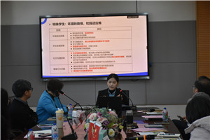 活动于下午13:30正式开始。在会议室,与会嘉宾首先观看了学校介绍片,初步了解康外实中的办学理念与发展历程。随后,学校常务副校长赵蕾以《以爱为基,以融促长》为题,系统介绍了康外实中在融合教育方面的顶层设计、课程建设、师资培养及家校社协同等方面的实践与思考。她强调,康外始终秉持“尊重・互助・共赢”的融合教育理念,致力于为每一位特需学生营造温馨、包容、平等的成长环境。