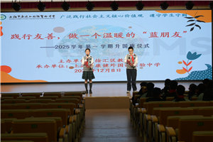 发布者:为践行社会主义核心价值观,弘扬友善美德,让温暖互助的氛围浸润校园,上海市康健外国语实验中学于2025年12月8日举办了主题为“践行友善,做一个温暖的‘蓝朋友’”的国旗下讲话。本次活动以校园生活点滴为切入点,深入诠释了“友善”这一核心价值观的内涵。本次活动由六2雪狼中队主持。