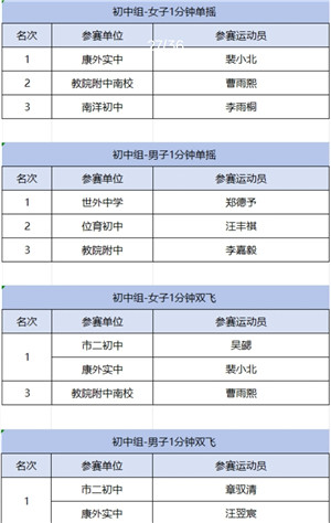 赛事中,康外学子在个人项目中捷报频传。男子组双摇比赛中,汪翌宸同学身姿矫健、节奏稳健,以惊人的耐力和爆发力一路领先,最终摘得男子组双摇第一名,用实力诠释了“绳速之巅”的真正含义。女子组双摇赛场同样精彩,裴小北同学绳影翻飞、步伐轻盈,凭借稳定而高效的发挥,成功斩获女子组双摇第一名,为康外实中再添荣耀。在单摇项目中,张乐然,李宇晨等同学同样表现出色并取得了优异成绩,充分展现了康外学子的速度与毅力。