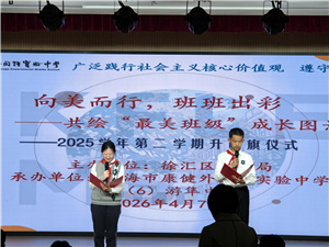 发布者:2026年4月7日,康外实中第6周升旗仪式由八(6)中队主持,主题为“向美而行,班班出彩——共绘‘最美班级’成长图景”,全校师生共同探寻班级之美,发起创建倡议,让美的理念浸润校园、扎根心间。